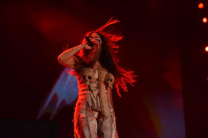 Senidah je na scenu izašla u moćnom izdanju. Odlučila se za kombinezon boje peska, a njegovoj neutralnoj boji notu opasnosti dale su dve lobanje koje su se nalazile na grudima.