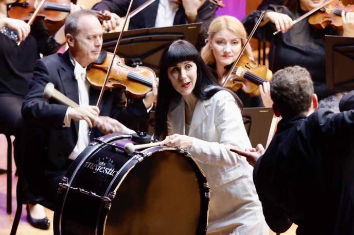 Konstrakta se pojavila u sasvim novoj i neobičnoj ulozi - kao solistkinja na bas bubnju u kompoziciji Ričarda Šarape. Čim je stupila na scenu Kolarca izazvala je ovacije, a uz filharmoničare i dirigenta Morica Gnana je izvela kompoziciju-parodiju uz skeč soliste koji je u “svađi” sa dirigentom. Pored toga što se šarmantno “prepirala” sa dirigentom u ulozi perkusionistkinje koja udara o bas bubanj kako ona želi, imala je svoj solo performans, pa se pesma “Umetnica mora biti zdrava”, orila Kolarcem.