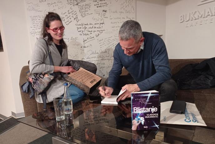 U prepunoj kafeteriji Bukmarker, filozof i ekonomista Vladimir Đukanović predstavio je svoj prvi SF roman „Blistanje“. Promociji je prisustvovalo nešto više od 200 ljudi.