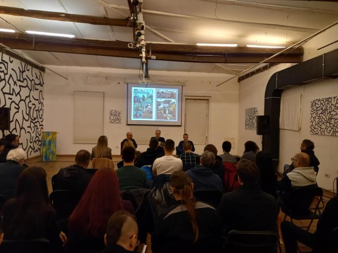 Umesto klasičnog razgovora o najnovijem stripu koji se predstavlja srpskoj publici, veče je proteklo dubokoj filozofskoj analizi motiva I modela stvaralaštva i interakciji sa publikom u kojoj je bilo mnogo značajnih strip autora poput Alekse Gajića, Igora Kordeja, Jane Adamović, ali i mladih nada srpskog stripa.