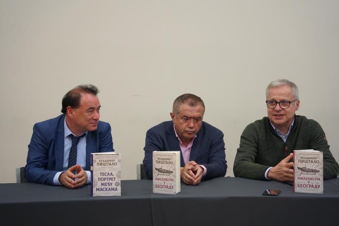 Tokom predstavljanja prve dve knjige "Tesla, portret među maskama" i "Milenijum u Beogradu" govorili su Vladimir Pištalo, pisac, Dejan Papić, direktor Lagune i Nenad Šaponja ispred Agore.