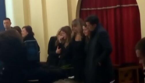 Porodica je na Novo groblje došla autom sve do kaperele, a potpom je ušla unutra gde im prijatelji i kolege pokojnog glumca izjavljuju saučešće. Prisutni u kapeli grcaju u suzama dok se čuju pesme, među kojima je i "My Way", "Zlatni dan" i "Jeleni umiru sami", a neutešna porodica stoji sa bolom na licu.