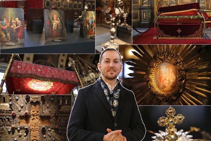 - Saborna crkva Svetog arhangela Mihaila svedok je i naše burne istorije, videla je i smene dinastija, oba svetska rata, naciste, čiji je glavni štab bio upravo prekoputa, u Patrijaršiji - priča nam Stefan Zeljković iz Informativne službe SPC, koji nam na samom početku pokazuje jedan od najstarijih predmeta - prestoni krst kir Venijamina iz druge polovine 17. veka, kao i grčko jevanđelje s početka 18. veka, oboje iz stare crkve.