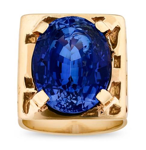 Izrađen od 14-karatnog žutog zlata, Prislijevog omiljenog metala, ovaj upadljivi komad odražava kraljevu fantastičnu  scensku pojavu iz tog perioda. Prsten je dizajniran posebno za nastupe na sceni, sa intenzivnim plavim sintetičkim safirom u centru, koji je hvatao i reflektovao jake svetlosne efekte.