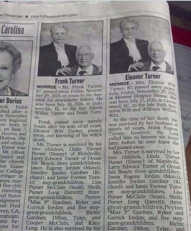 Šest sati kasnije njen suprug Frenk umro je zbog problema s plućima, ali nije znao da je u međuvremenu preminula i Eleanor. Njihova ljubavna priča, koja bi se mogla nazvati ljubavnom pričom iz bajke počela se prepričavati nakon što su im objavljenje čitulje u novinama, jedna pored druge.