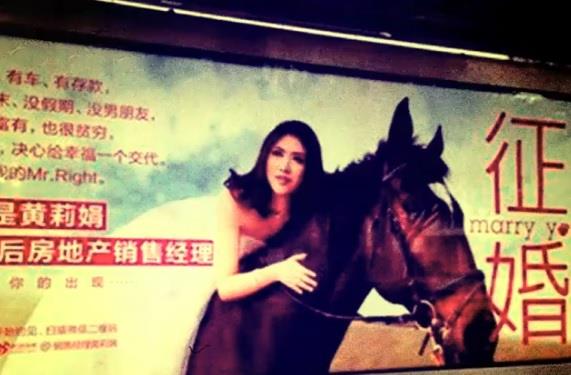 Na slikama, Lijuan je odevena u belu venčanicu i dok jaše na konju poručuje: "Imam kuću, automobil i ušteđevinu. Tražim godpodina Pravog. Srećna 2014".