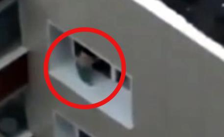 Tek na kraju šokantnog snimka dete, za koje se veruje da je iz Indije, uhvatio je i povukao unutra neko iz stana.