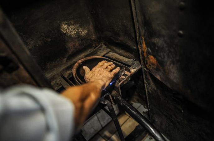 "Moja stara pegla teška je 30 kilograma, a dodatno je težom činim potiskivanjem nogom preko odeće. Peglu prvo zagrijem na vatri, a pošto ona nema sistem za prskanje odeće vodom i to ja moram raditi tako što iz usta prskam vodu pre peglanja. Nakon prskanja odeću peglam zagrejanom peglom", objasnio je Salih.