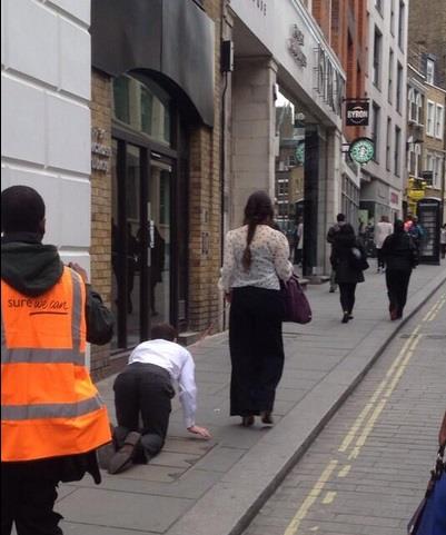 Zapanjeni prolaznici fotografisali su i snimali čoveka koji je svečano obučen na kolenima puzao po prljavom asfaltu.