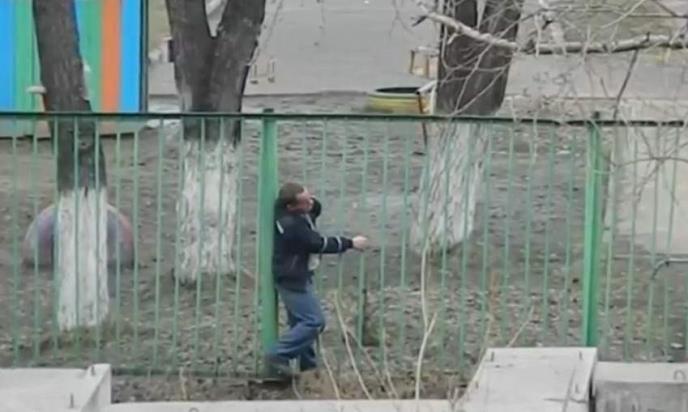 Čovek koji je očigledno pijan najpre je pokušao da se provuče između dve šipke na ogradi, a kada mu to nije pošlo za rukom, pokušava da preskoči istu... Međutim, ni to mu ne ide.. A onda mu je jedan dečak "otvorio oči".