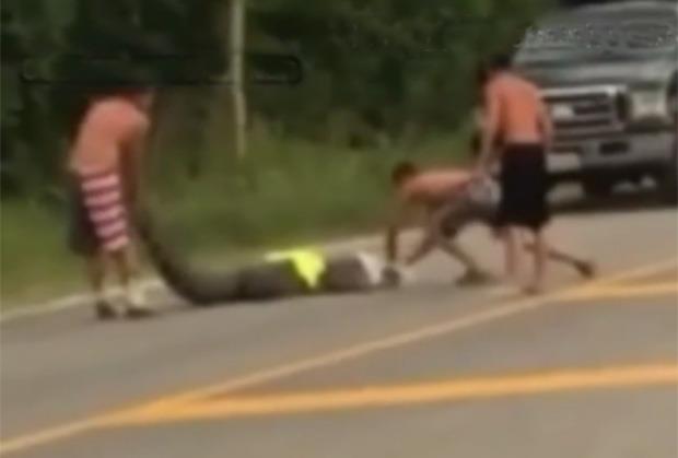 SULPHUR - Glen Bonin iz mesta Sulphur u saveznoj državi Lujzijani mislio je da ima super plan kako bi sa prijateljima pomerio džinovskog aligatora od 11 metara sa puta koji je blokirao i zaustavio saobraćaj.
