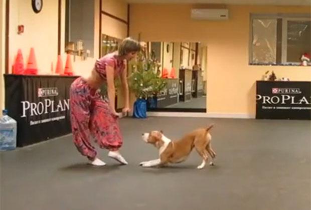 Da postoji takmičenje talenata među životinjama, ovaj pitbul bi bez sumnje osvojim prvo mesto. Uz istruktorku je savršeno izveo trbušni ples, a u jednom trenutku ga čak možemo videti kako se propinje na zadnje noge i njiše u ritmu muzike.