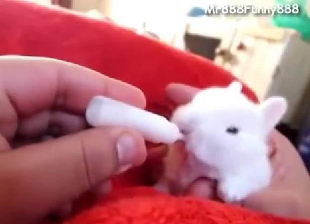 U pitanju je mladunče zeca koje je toliko malo da mu je i dlan odraslog čoveka veliki. Snimak koji se pojavio na Jutjubu prikazuje ovog malenog zeca koji halapljivo guta mleko iz bičice.
