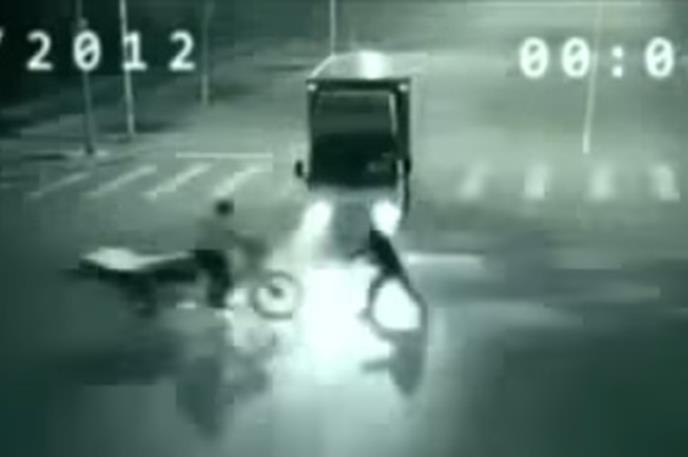 Na snimku sigurnosnih kamera, čija autentičnost teško može da se ospori, vidi se čovek koji vozi bicikl sa prikolicom. Na raskrsnici na njega naleće kamion. Međutim, tada se pojavljuje misteriozno biće i brzinom munje ga čupa iz kandže smrti. Pogledajte!