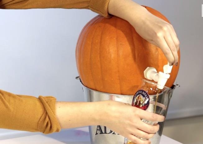 U zavisnosti od toga koliku bundevu ste odabrali, verovatno će vam trebati između šest i 12 piva da napunite ovo pivsko bure. Kada ste bundevu napunili pivom, vratite repeljak odozgo, tako da bundeva bude zatvorena.