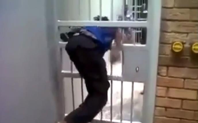 Afroamerikanac ima specijalnu taktiku kojom prolazi tamo gde niko nije prošao. Provukao se kroz otvor od samo deserak centimetara! Poput čoveka od "gume" prošao je kroz vrata, poput terminatora iz drugog dela čuvenog bestselera.