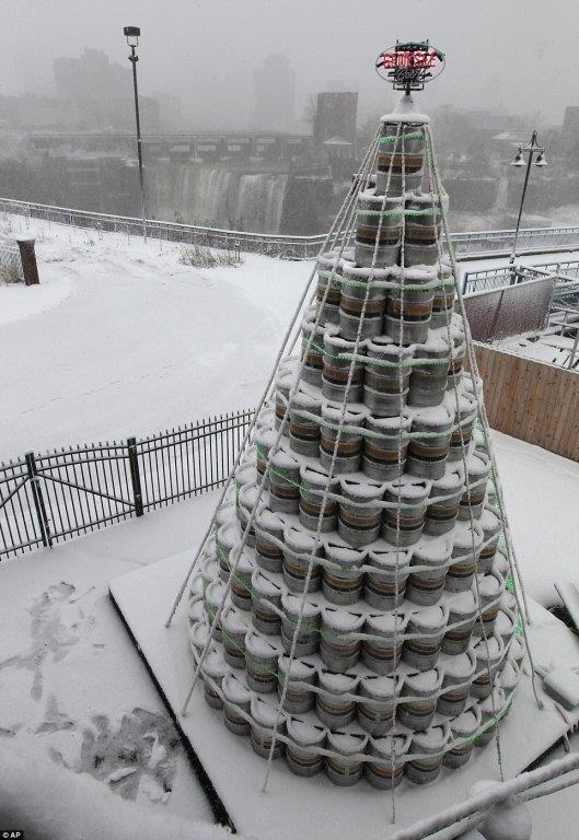 ROČESTER - Jedna pivara u zapadnom Njujorku napravila je božićno drvo od stotina pivskih bačvi. Kompanija Dženesi (Genesee) izgradila je sedan metara visoko božićno drvo od 300 čeličnih bačvi ispred svoje pivare u centru Ročestera, piše AP.