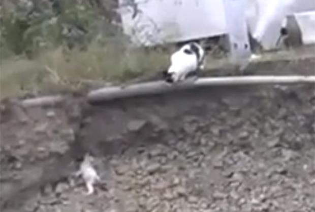Mačka je neko vreme čekala da njeno najdraže na svetu samo skoči na nasip.