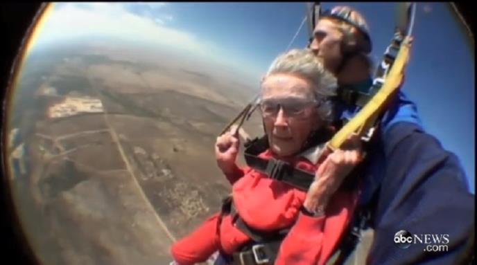 Jučerašnji skok treći je za Harvudovu koja je prvi put skakala sa padobranom 2007. kada je imala 92.