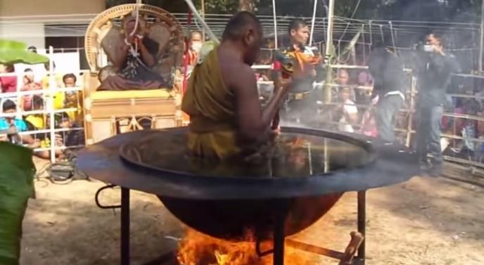 Normalni podvizi snage nisu bili dovoljni za jednog budističkoh monaha u Tajlandu. On je odlučio da svoju meditaciju podigne na novi nivo: On meditira u lotus poziciji uronjen do pojasa u vrelo, ključalo ulje.