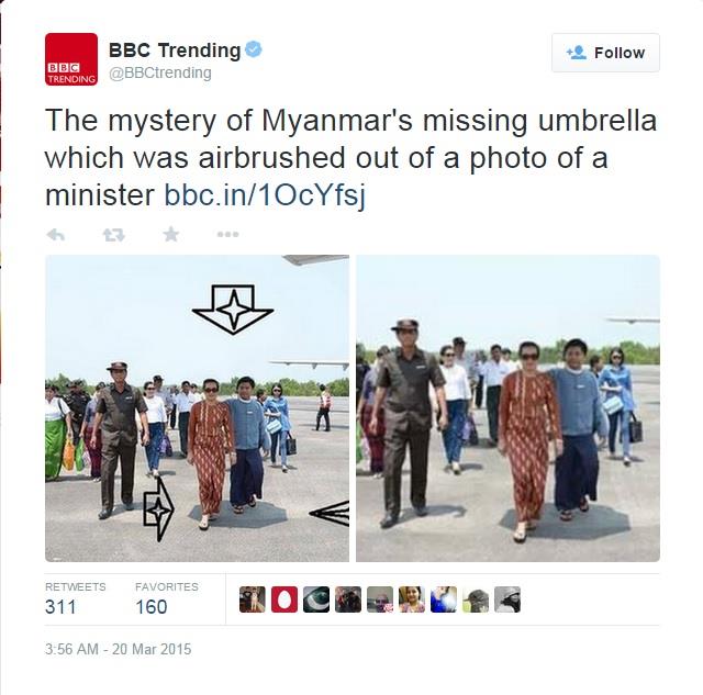 Međutim, sadržaj koji inače nikog ne bi zanimao ovoga je puta "zapalio" internet. Naime, jedan korisnik zapazio je na fotografiji misterioznu senku na tlu, tačno ispod nogu zamenice ministra. Brzo je zaključio da je fotografija ispravljana u fotošopu, a s nje izbrisan kišobran koji je jedna muškarac držao nad glavom Su Su Hlaing. Ali, ko god da je uređivao fotografiju, zaboravio je da skloni i senku kišobrana.