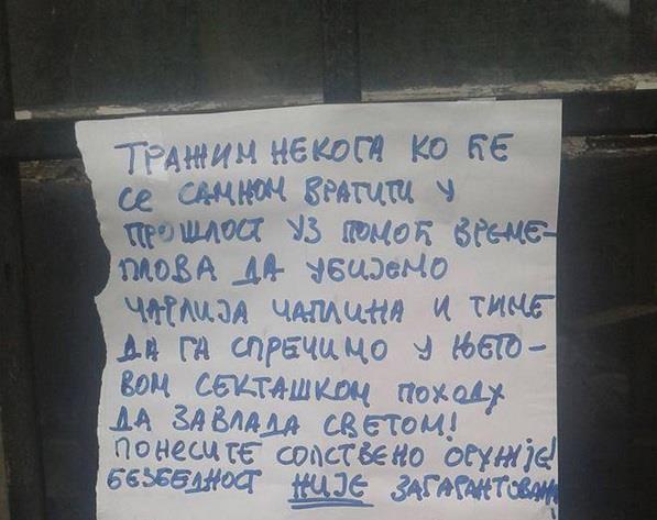 "Tražim nekoga ko će se samnom vratiti u prošlost uz pomoć vremeplova da ubijemo Čarlija Čaplija i time ga sprečimo u njegovom sektaškom pohodu da zavlada svetom! Ponesite sopstveno oružje! Bezbednost nije zagarantovana!
