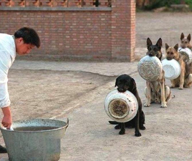 Dok im "kuvar" sipa hranu iz kazana, oni su poređani u redu jedan iza drugog, držeći u zubima svoje činije za jelo.
