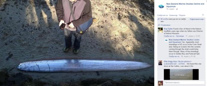 Riba pojas, čiji latinski naziv glasi Regalecus glesne, jedan od istinskih džinova morskih dubina, o kome naučnici začuđujuće malo znaju, nedavno je otkriven na obali mora u Aramoani, na Novom Zelandu.