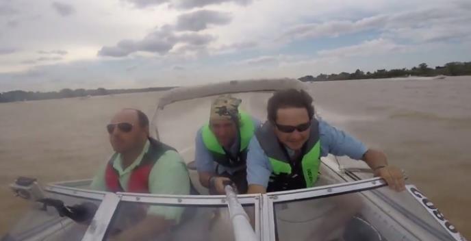 Na snimku su prikazani ribari koji se pripremaju za jedno tačmičenje, kada iznad njih na skoro metar nadleće avion.