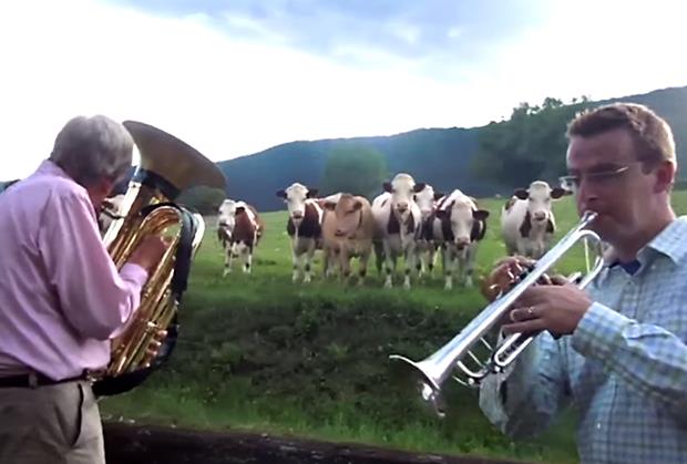 Čim su se začuli prvi zvuci trube, krave (koje očigledno imaju sluha) su počele da podižu glave i zainteresovano prilaze ovim vickastim muzičarima.