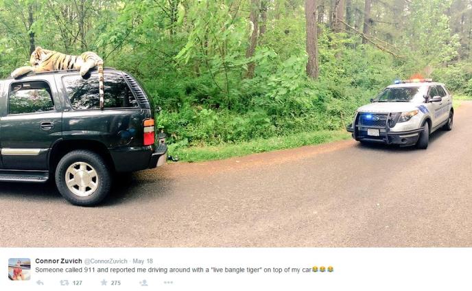 "Video sam par momaka u tamnom vozilu na kome je ležao bengalski tigar. Mislim da je ovo prilično ozbiljno", rekao je uznemireni čovek. Međutim, kada je policija došla utvrdila je da je u pitanju povelika plišana životinja koju su momci iz "tamnog vozila" stavili na krov automobila da bi ga lakše prevezli.