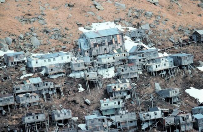 Oslanjajući se na strmoj litici na stotine kuća nalazi se u napuštenom selu Ukivok. Ovo je nekada bio dom značajne populacije ljudi koji su se nazivali Aseuluk ili "narod mora".