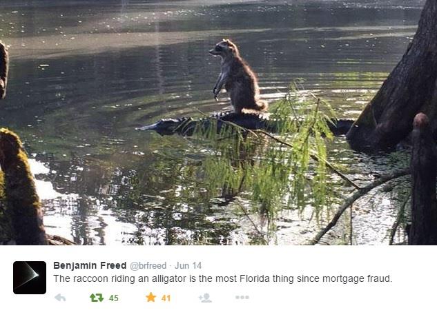 Ričard Džons šetao je sa porodicom u Nacionalnom parku Okala na Floridi kada je fotografisao čudan prizor. Naime, rakun se "vozio" na leđima aligatora, baš kao u crtanim filmovima. Naravno, fotografija ovog fantastičnog dvojca postala je hit na Internetu.