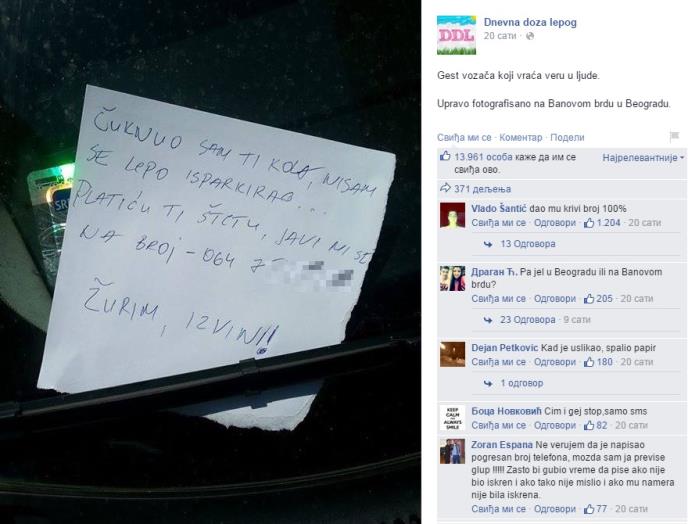 U opisu fotografije koju je neko snimio na Banovom brdu u Beogradu stoji "Gest vozača koji vraća veru u ljude",a objavljena je na Fejsbuk stranici "Dnevna doza lepog". Za manje od 24 sata skupila je više od 13.500 lajkova i pregršt komentara u kojima se uz, uz pozitivne reakcije i pohvale, našlo i onih koji izražavaju sumnju.