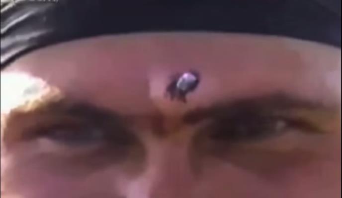 Kao što možete da vidite metak je jedva prošao kroz čelo, tako da je ili njegova lobanja napravljena od ugljeničnih vlakana ili je upucan sa jako velike udaljenosti što sumnjamo ili ono što je verovatno slučaj, ovo je metak koji je pre njegove glave prošao kroz više objekata.