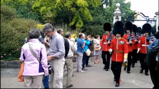 U svojim prepoznatljivim crvenim odorama i crnim kapama vojska je uložila minimalan trud kako bi zaobišla nesrećnog fotografa koji je uopšte nije obratio pažnju da mu se približavaju. Kraljičina straža čuva službene kraljevske rezidencije, a ovih dana se proslavljao i njen rođendan.