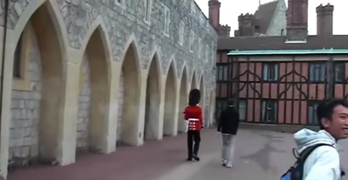 Posetilac se s njim naime šalio tako što ga je pratio u stopu, ali onda je stavio svoju ruku na njegovo rame, čime je očigledno preterao. Čim je stražar uzviknuo "Odmakni se od Kraljičine garde!" i uperio pušku prema njemu, izgubio se u roku sekunde.