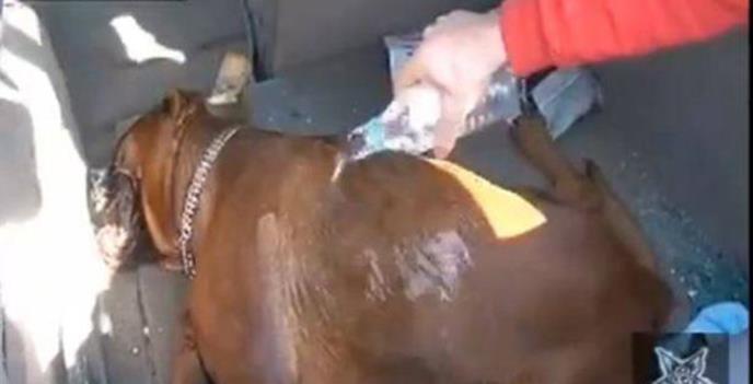14-mesečni bokser Fiđi primećen je u automobilu u besvesnom stanju, pa je alarmiran policajac koji je razbio prozor kako bi ga izvukli napolje i spasili ga.
