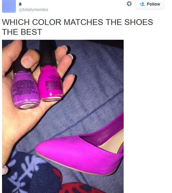 Sećate li se haljine koja je srušila internet? Evo još jednog gorućeg pitanja! Jedna devojka je na Tviteru pitala koji lak za nokte se najbolje slaže sa njenim cipelama. To pitanje je mnoge zaintrigiralo, jer jedni kažu da je levi lak iste boje kao cipele, a drugi da je desni. Šta vi kažete?