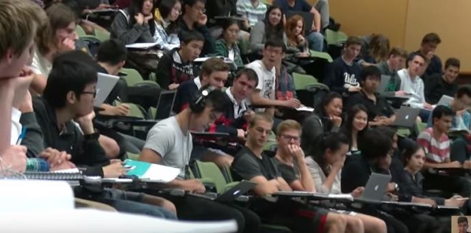 U jednom trenutku shvata da se događa nešto neobično, i neuspešno pokušava ponovno da uključi slušalice, a kad mu to ne pođe za rukom, izlazi iz dvorane praćen smehom studenata.