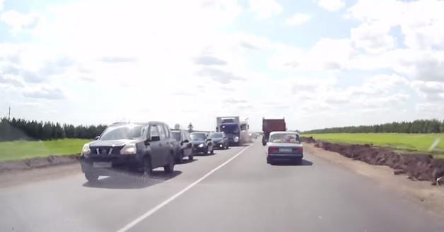 Na ovom snimku, napravljenom negde u Rusiji, vozač (i putnici) automobila iz kog se snima imali su veliku sreću, kada se odjednom, u suprotnoj traci, dogodio pravi karambol, pri čemu su dva kamiona završila u suprotnoj kolovoznoj traci!