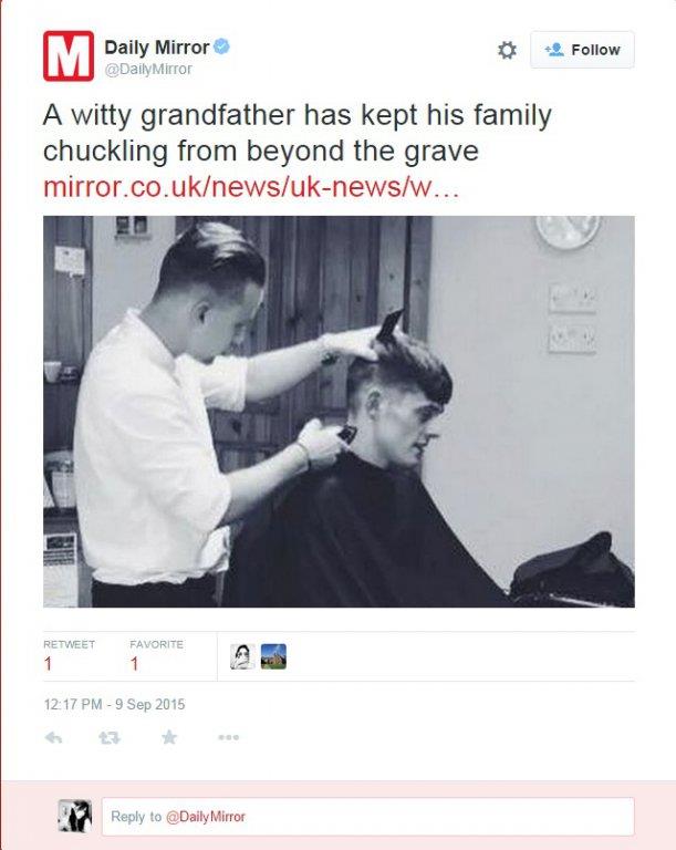 "Tomi je umro kada sam ja imao samo nekoliko meseci, pa je pronalaženje ove poruke bilo neverovatno. Tako sam stekao uvid u to kakav je bio i kakav smisao za humor je imao kada je mogao da ostavi ovakvu poruku", rekao je Alan koji je četvrta generacije berbera u porodici.