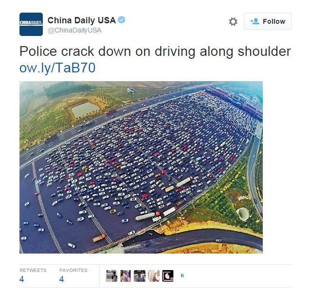 Ekspresni auto-put sa 50 traka "uliva" se pred Pekingom na rampu od samo 20 traka. Prilaz rampi tako je postao usko grlo, koje je napravilo pravi haos sa hiljadama vozila u redovima.