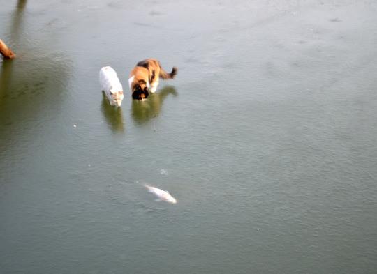 Ako želite da vidite kako svetle oči mačke, jedino što treba da im date je dobar komad sveže ribe. Njihov mali mozak poludi za plodovima mora. Nažalost, ovaj mačji duo ne može da se dočepa ribe koju je pronašao ispod zamrznute vode.