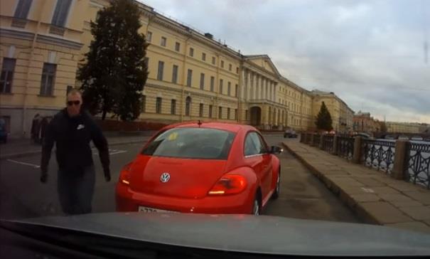 Ovaj snimak prikazuje čoveka koji crvenom "Bubom" preseca put autoru snimka. Prirodno, vozač revoltirano trubi. Ali, očigledno, to je samo dodatno iznerviralo već razjarenog vozača, koji se zaustavio da bi iskalio svoje frustracije na šoferšajbu vozača koji je sve ovo zabeležio na snimku.