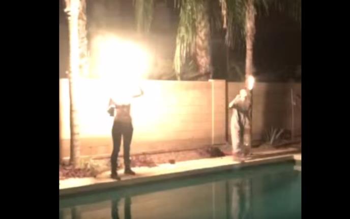 Umesto da skoči ili zaroni glavu u bazen koji je ispred nje, ona panično pokušava da ugasi vatru trljanjem i udaranjem, pre nego što joj prijateljica pomaže da zaroni lice u vodu.