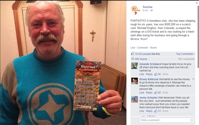 Majkl Engfors iz Aspena u Koloradu, SAD, većinu noći je provodio u centru za beskućnike. "Ipak, nije odustajao i verovao je da će mu se sreća jednog dana nasmešiti", rekao je direktor centra za beskućnike Džeremi Kovalis, koji nije mogao da poveruje da je Majkl umesto hrane kupio tiket od 10 dolara. Ali isplatilo se jer je Majkl dobio pola miliona dolara. "Ovo je jako dobra priča i inspiracija za mnoge ljude jer pokazuje kako se sreća može svima nasmešiti", zakjlučio je Kovalis.
