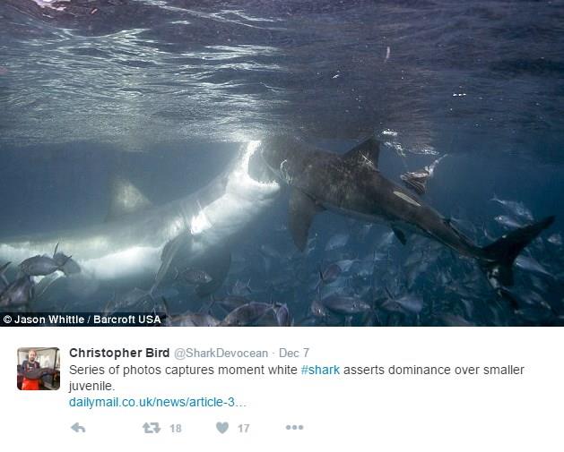 Velika bela ajkula je preteći krenula čeljustima na manju ajkulu, kao pretnja, da se zna ko je kazda i čiji je to obrok. Na kraju, ipak je nije ščepala zubima.