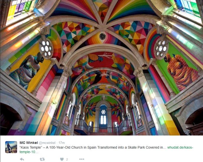 U "biblijskom" periodu od sedam dana, kako piše madridski Pais, uspeo je da prekrije zidove crkve freskama jarkih boja i geometrijskih oblika.