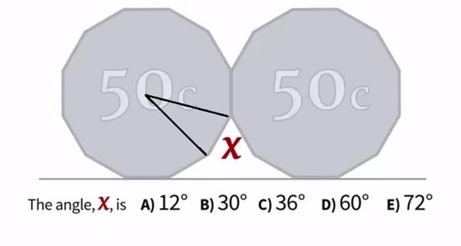 1. Dva novčića od 50 centi prikazani su sa 12 jednakih stranica, ali im je zajednička samo ona u kojoj se dodiruju. Zadatak je da se odredi koji uglao zaklapaju dva novčića, a ponuđeni odgovori su: 12, 30, 60 i 72 stepena.